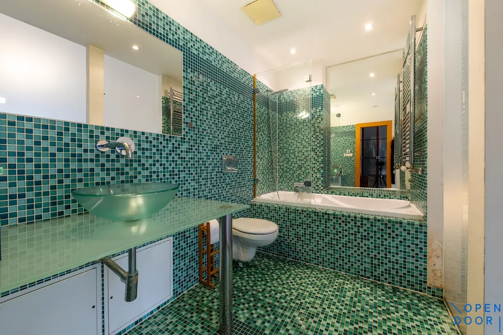 Nabízený byt má vstup z vnitřního atria přes halu s členitými vestavěnými skříněmi do otevřeného obývacího prostoru se zajímavě řešeným kuchyňským koutem vybaveným spotřebiči (lednice s mrazákem, myčka nádobí, pračka, varná deska s troubou). Z navazující chodby je přístupná originálně řešená koupelna s vanou, WC je umístěno v koupelně, a dále ložnice, kterou prosklená stěna odděluje od terasy, přecházející v zahrádku těsně sousedící s chráněným územím zdejšího lesoparku.