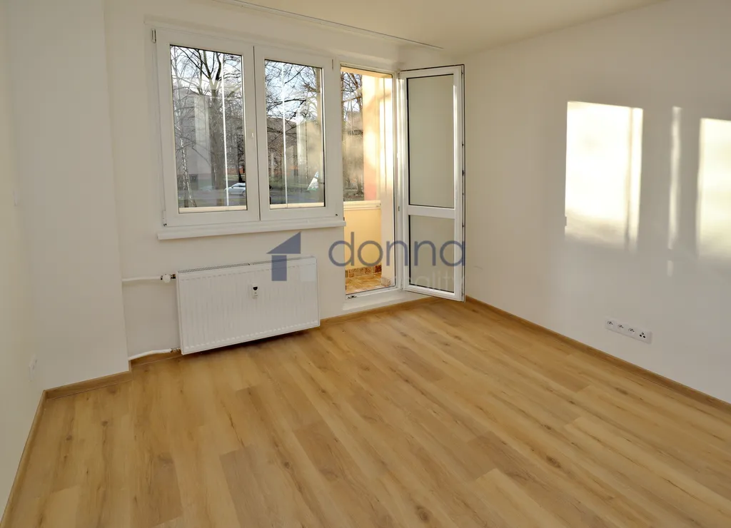 Z obývacího pokoje se vchází do dalšího pokoje se vstupem na zasklenou lodžii s výhledem na vzrostlou zeleň. Podlahy vinyl a dlažba, topení centrální dálkové. Součástí nájmu je i sklep v suterénu budovy o ploše cca 3m2.