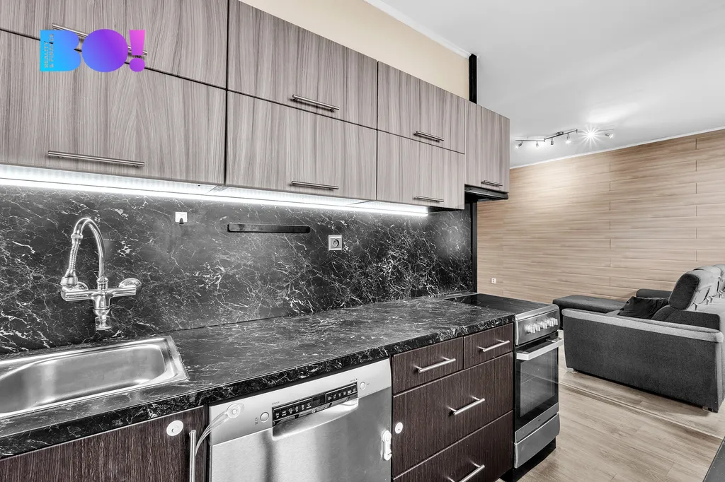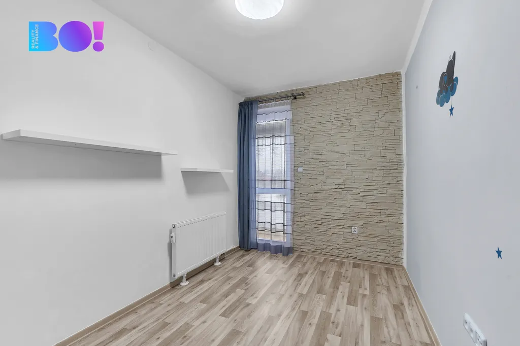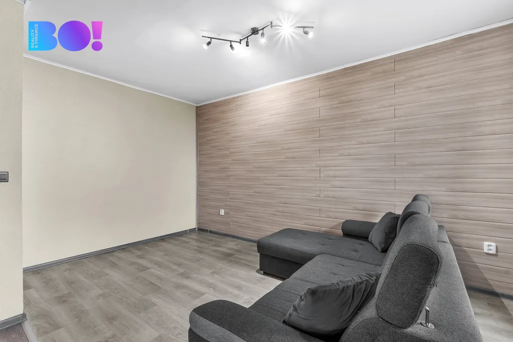 Dispozice: vstupní chodba, obývací pokoj spojený s kuchyní a jídelní částí, ložnice, 2x pokoj, koupelna WC. Byt nabízí velkou lodžii, orientovanou na jihovýchod, přístupnou z ložnice/dětského pokoje. Kombinací vysokého patra a otevřené dispozice mezi obývacím pokojem a kuchyňskou částí je byt příjemně světlý a působí moderním dojmem. Kuchyňská linka je zařízena vestavěnými spotřebiči, disponuje myčkou, sklokeramickou deskou, horkovzdušnou troubou a digestoří.