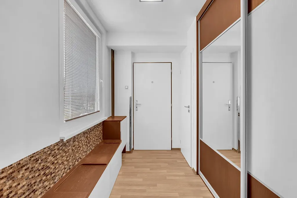 Byt se nachází v přízemí s pěkným výhledem, dům je vybavený výtahem. V prvním patře se nachází vstupní chodba, kuchyňský kout a velkorysý obyvací pokoj se zasklenou lodžií, v druhém patře jsou tři samostatné pokoje a koupelna. V obou patrech je dostatečné množství úložných prostor ve formě vestavěných skříní.