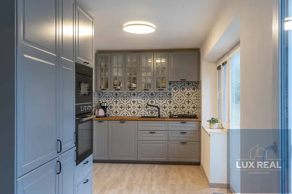Kuchyně je komplet vybavena vestavěnými spotřebiči (myčka, mikrovlná trouba, elektrická trouba, lednice s mrazícím boxem).