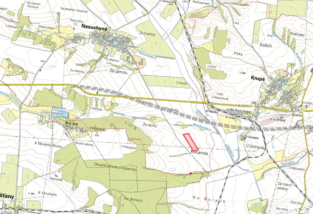 V katastrálním území Nesuchyně, okres Rakovník, nabízíme k prodeji vlastnictví na dvou pozemcích zapsaných na listu vlastnictví č. 322. Jedná se o rozsáhlou parcelu orné půdy doplněnou o menší lesní pozemek.
