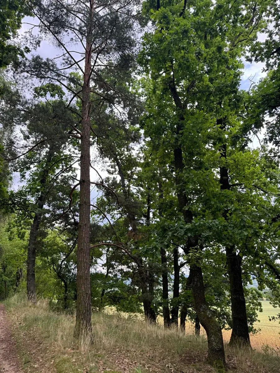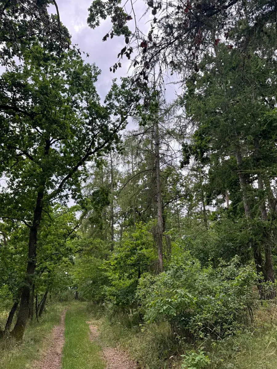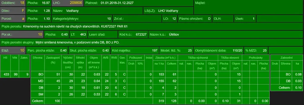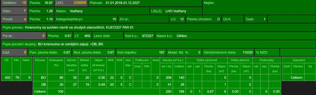 - p.č. 61 vedená jako lesní pozemek o celkové výměře 10 906 m2 (stáří lesa 106 let - zastoupení dřevin borovice, modřín, dub, smrk, stáří lesa 86 let - zastoupení dřevin borovice, dub)