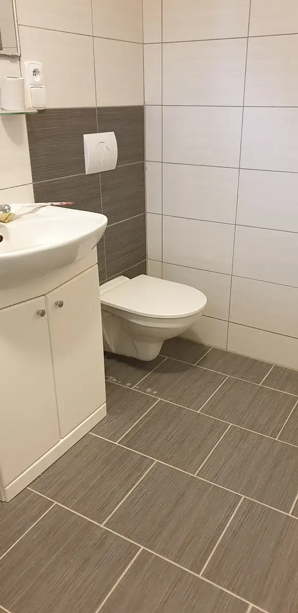 Podlahy plovoucí a dlažba, bytové jádro se sprchovým koutem, kuchyňská linka a sporák v ceně bytu.