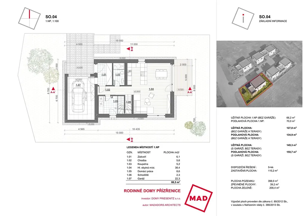 Celková plocha pozemku je 398m², plocha zahrady 208,4m² a terasa na střeše 1NP má 21,4m².