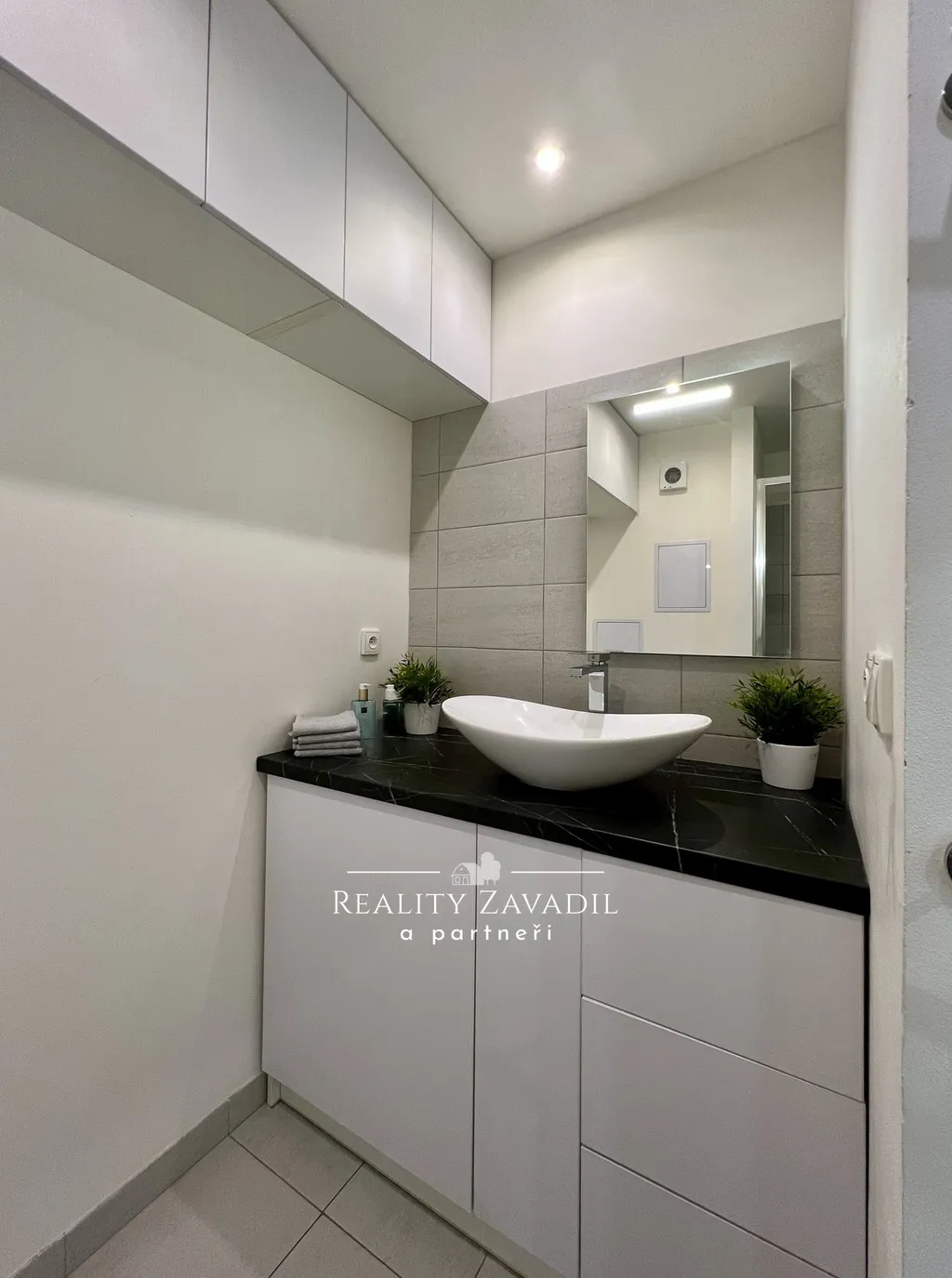 V koupelně, která též prošla rekonstrukcí se nachází sprchový kout, toaleta, umyvadlo a skříňka se zabudovanou pračkou se sušičkou.