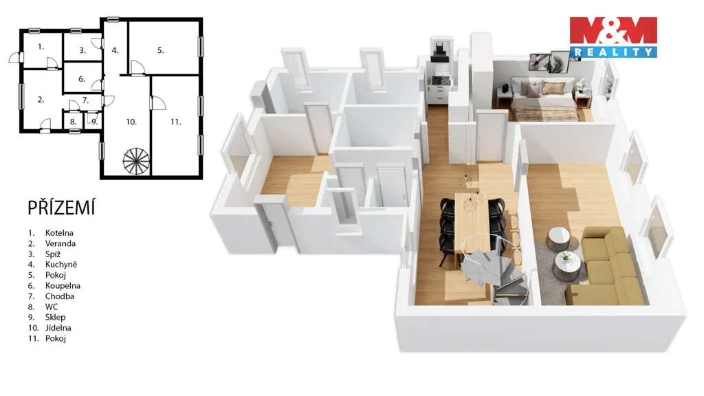 Hledáte místo, kde skloubíte klid venkova s aktivním životem a investičním potenciálem? Tento rodinný dům 5+1 ve Všejanech nabízí přesně to. Se 130 m² užitné plochy a velkým pozemkem 1.603 m² je ihned připraven k bydlení, ale zároveň Vám dává volnou ruku pro rekonstrukci a realizaci vlastních představ (možnost odděleného bydlení v podkroví se samostatným vstupem). Přízemí: Obývací pokoj, ložnice, jídelna, kuchyň, spíž, koupelna, WC, veranda a kotelna. Patro: 3 místnosti, kuchyňský kout, koupelna s vanou a WC, terasa. Vytápění zajišťuje tepelné čerpadlo (i kotel na TP). Na pozemku naleznete garáž, dílnu, skladové prostory a zapuštěný bazén pro letní relaxaci. Zahrada je oddělena suchým korytem. Občanská vybavenost v obci: MŠ, OÚ, obchod, Pivovar Tahoun, vlak/bus, koupaliště. ZŠ a pošta v Čachovicích. Okolí je plné lesů, ideálních pro houbaření a procházky, a protkáno cyklostezkami. Místní sportovní život obohacují fotbalový klub a automodelářský spolek. Plná vybavenost v Benátkách n/J.