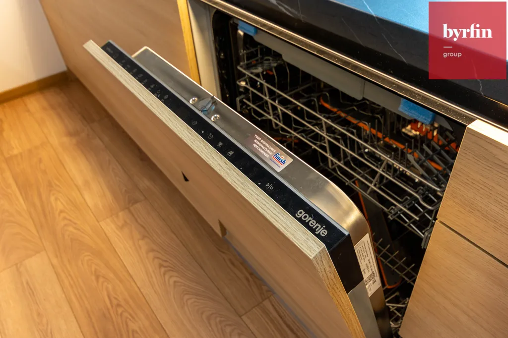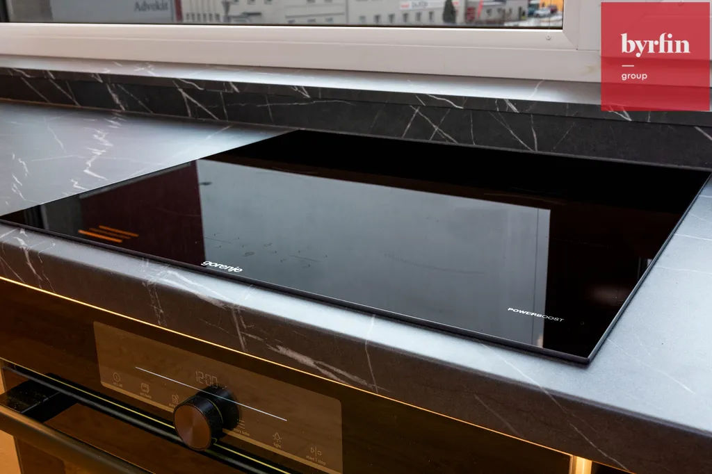 Kuchyňská linka je kompletně vybavena spotřebiči Gorenje (lednice, myčka, trouba, indukce) a perfektně ladí se zbytkem bytu. Koupelna nabízí prostorný sprchový kout, přičemž WC je řešeno samostatně — praktické a pohodlné.