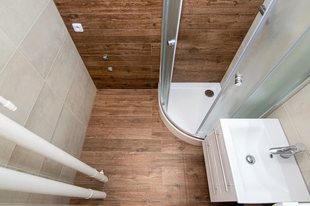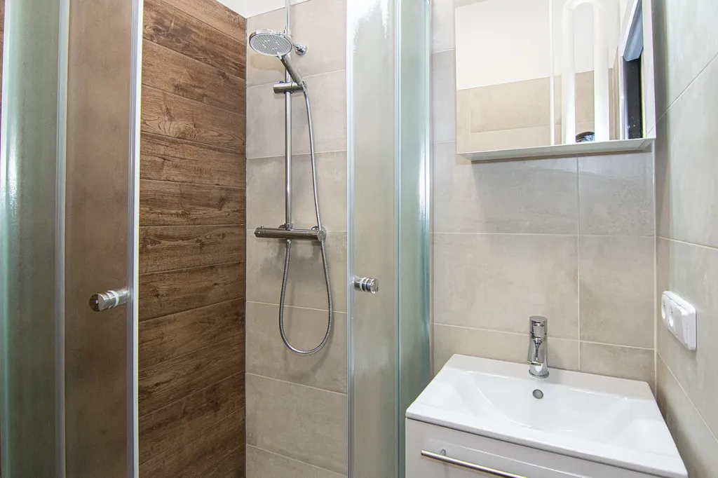 Koupelna je vybavena proskleným sprchovým koutem. Toaleta je samostatná.