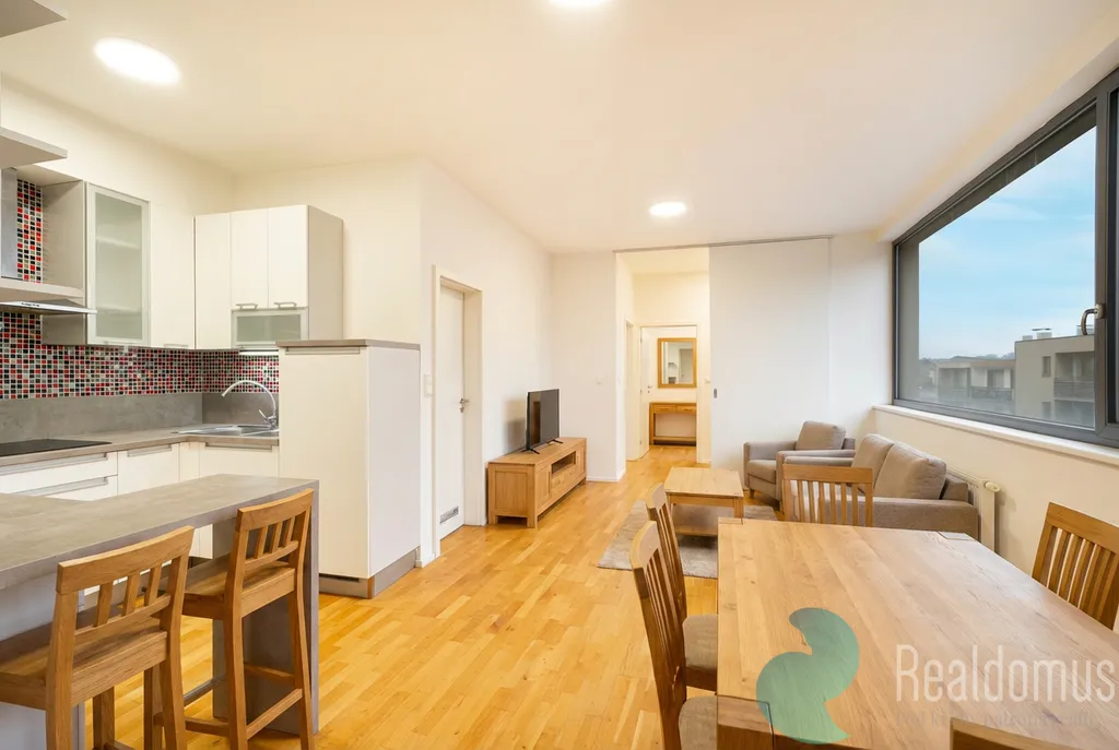 Byt je promyšleně dispozičně řešený tak, aby poskytoval maximální soukromí a komfort. Oddělení obytné a klidové části zajišťuje předsíň a především hala mezi obytnou a ložnicovou částí. Po vstupu do bytu vás přivítá prostorná předsíň (7,9 m²), ze které se vstupuje do vzdušného obývacího pokoje s kuchyňským koutem (23,9 m²). Na obytnou, rušnější část bytu navazuje hala, ze které je vstup do dvou neprůchozích pokojů (10,4 m² a 13,5 m²), ideálních jako ložnice, dětský pokoj či pracovna. Koupelna s vanou a WC je prakticky řešena přes malou předmístnost s umyvadlem.