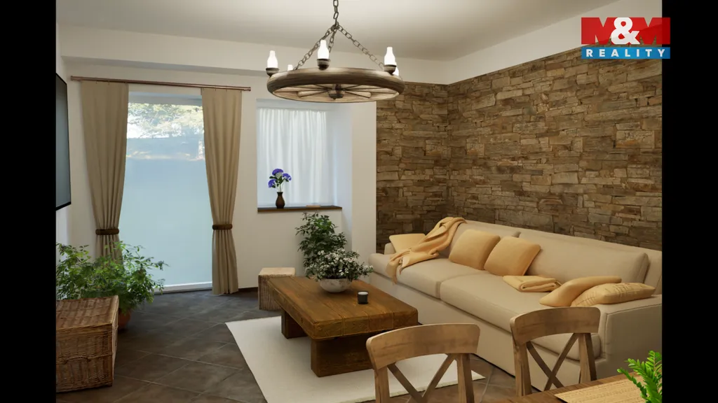 Tento byt se nachází v 1.NP rekonstruovaného domu, ve kterém je více bytů venkovského stylu. Byt má 65 m2 a je tu vstupní chodba, obývací pokoj s kuchyňským koutem, dvě ložnice, koupelna s vanou, umyvadlem a WC, dále pak komora. Orientace bytu je východ a západ. V bytě byly opraveny a ponechány původní opukové zdi, v obývacím pokoji jsou i dřevěné trámy, které umocňují venkovskou atmosféru bydlení.