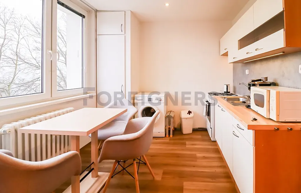 Byt je částečně vybavený – k dispozici je kuchyňská linka se sporákem, lednička, pračka, obývací stěna a nová koupelna. Dispozice je praktická a byt působí velmi příjemně a vzdušně.