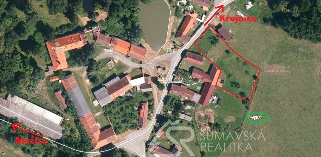 Lokalita: malá vesnička Vojnice v malebné krajině pod Šumavou, ležící v okrese Strakonice (vzdálené 17 km) náleží pod střediskovou obec Volenice. V celkem 34 obydlí je zde hlášeno pouze 14 obyvatel. Na dohled se nachází i nejrozsáhlejší hrad Rabí a stále více oblíbenější šumavské horské středisko Kašperské Hory je vzdálené pouze 18 km. Nad vesničkou stojí a ochraňuje ji nově opravený a bílou barvou svítící kostel Navštívení Panny Marie se zachovalým letopočtem vzniku 1687 (viz fotogalerie). Snad největší zajímavostí a tak trochu záhadou jsou tři dochované barokní zámky ležící v sousedních vesnicích i v samotných Vojnicích. Jejich stavebně technický stav je však přímo úměrný situacím popsaných spisovatelem Evženem Bočkem v knihách o Poslední aristokratce. Ve východně ležících Mačicích se jedná o zámek již ze 14. století, v západně sousedící vesnici Tažovice je barokní zámek s francouzskou zahradou ve stylu Versailles. Ve Vojnicích se z bývalé tvrze barokní přestavbou ze 17. století dochoval zámek, jehož majitelem byl v 19. století i ředitel Škodových závodů v Plzni pan František Wellner. To jistě svědčí o oblibě tohoto kraje. Atraktivní je i pro příznivce motorismu – startuje zde i etapa rychlostní zkoušky Rallye Šumava: Vojnice – Hoslovice. Časté zatáčky, mírná stoupání i prudká klesání vyhovuje i cyklistům, kteří si zde užívají jízdu na velmi kvalitním asfaltu, kterým je Jihočeský kraj známý.