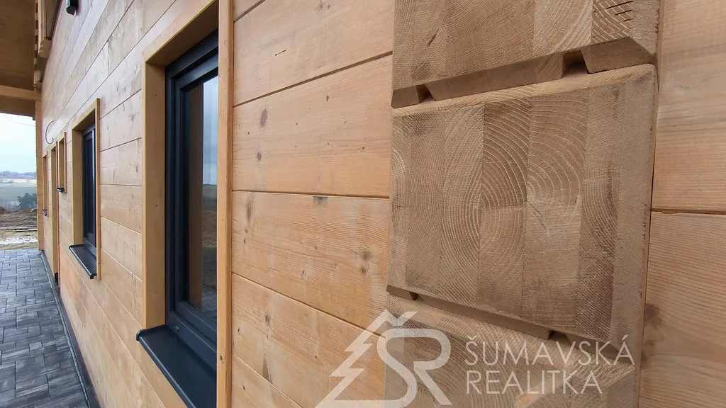 Popis nemovitosti: právě realizovaný rodinný dům je stavěný jako dřevostavba s roubenou obvodovou stěnou z lepených hranolů t.24 cm (bez sedání). Přírodní masivní dřevo je použito i uvnitř domů a vytváří tu správnou atmosféru. Dům je koncipován do tvaru „L“ s vlastní garáží na straně jedné a s velkorysým otevřeným obývacím pokojem s terasou na straně druhé. Uvnitř se nachází dvě ložnice (se šatnou), koupelna, samostatné WC, technická místnost a chodba. Pro užívání je připraveno i podkroví. Střešní krytina je Bramac Tegalit Protector, okna PVC Vekra, sanita od značek Villeroy Boch, Hans Grohe a Riho. Stavba je dokončena s použitím kvalitních standardů (podlahová krytina vinil, vypínače ABB Zoni v černé barvě a bezfalcové dveře). Stejně tak koupelny jsou voleny v materiálech a odstínech k přírodnímu dřevu. Vytápění zajišťuje tepelné čerpadlo Panasonic. Pro případného zájemce se mohou standardy upravit na přání.