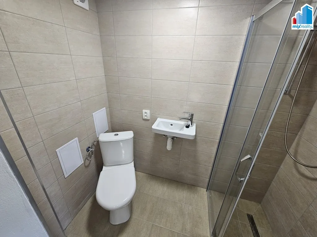 V bytě se nachází místnost s kuchyňským koutem, koupelna se sprchovým koutem a toaletou.
