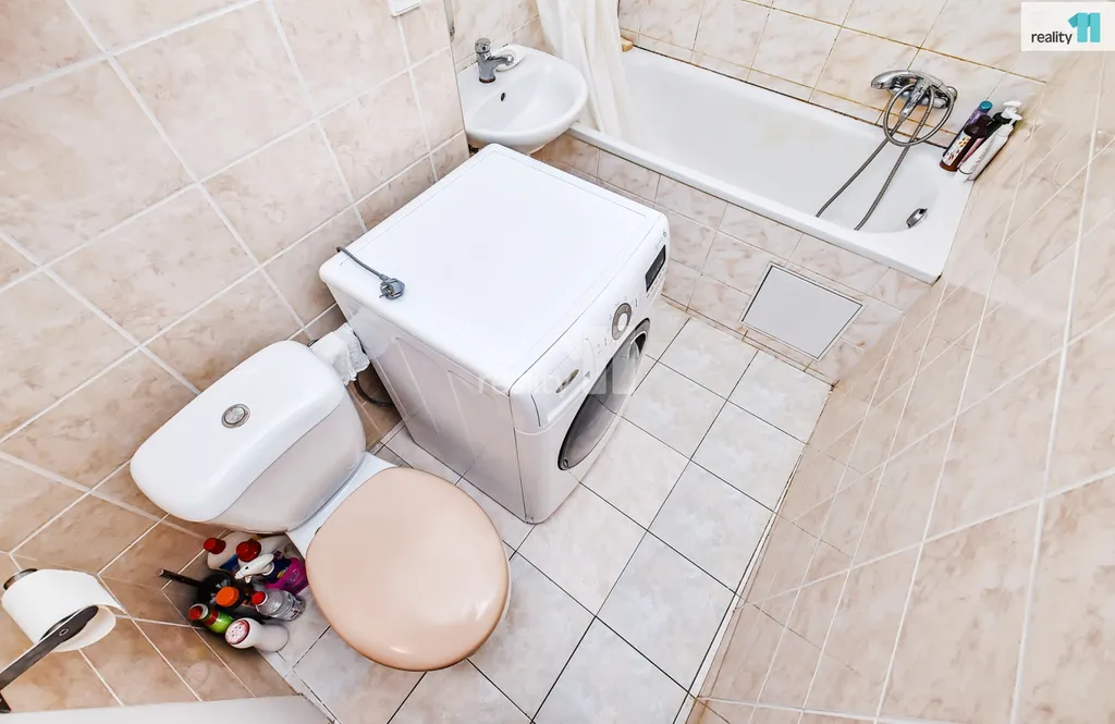 Rozměry místností: předsíň 3,43 m², obývací pokoj s KK 12,35 m², koupelna s WC 3,21 m², pokoj 17,10 m², komora 0,94 m². Vytápění je elektrickými přímotopy. Příprava teplé vody v elektrickém zásobníku. S výhledem do klidného dvora na západ. Koupelna je s vanou, umyvadlem a WC, vejde se tam i pračka.
