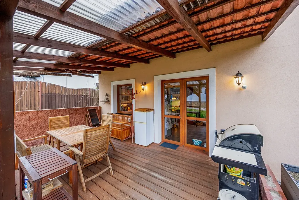 -V zadní části pozemku stavba, která slouží jako zázemí pro kola a zahradní nábytek