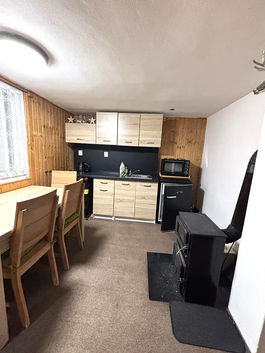 Kuchyň s kuchyňskou linkou, jídelním stolem, krbovými kamny a navazující obývací pokoj.