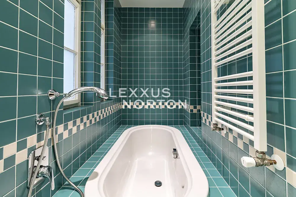 Interiér bytu tvoří vstupní hala, vzdušný obývací pokoj, kuchyň, dvě útulné ložnice, dvě koupelny (vana, sprchový kout, toaleta a bidet), dvě šatny a dvě komory.