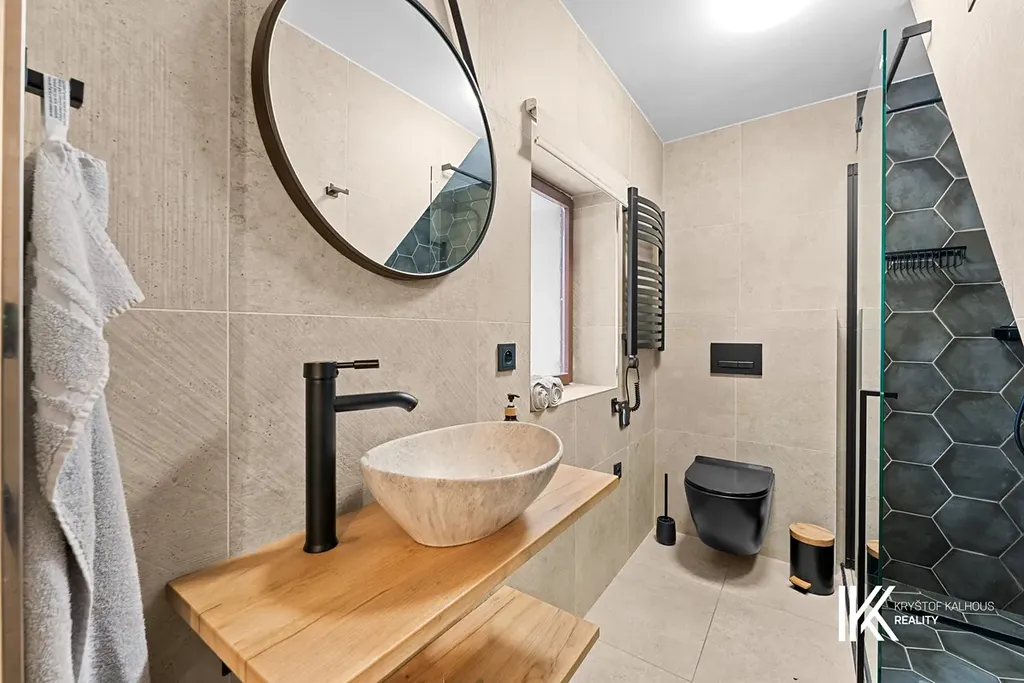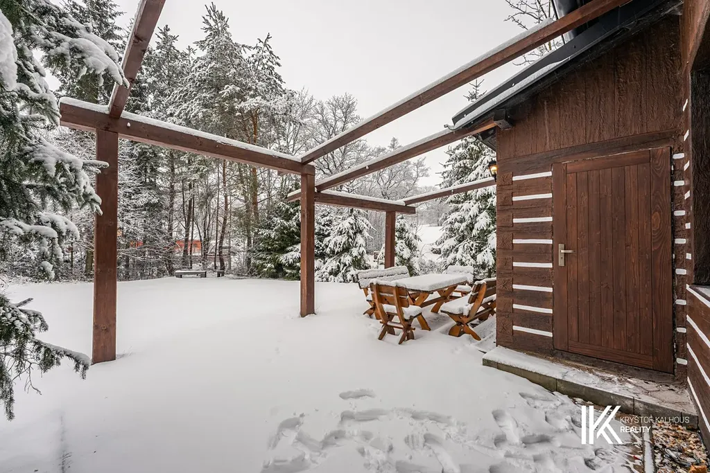 Prostorný obývací pokoj je přirozeným srdcem celé chalupy, jehož útulnou atmosféru podtrhují kamna na dřevo, která dokážou během pár okamžiků proměnit prostor v teplý, uklidňující úkryt před světem. Kuchyňská linka je navržená tak, aby zapadla do atmosféry chalupy a zároveň nabídla maximální komfort každodenního vaření. Pracovní deska je vybavena vestavěnou dvouploténkovou indukční varnou deskou, troubou i myčkou nádobí, doplněná o samostatně stojící lednici s mrazákem a praktickou mikrovlnnou troubu. Jen pár kroků od pracovního prostoru se za zašupovacími dvířky ukrývá malá spíž. Na kuchyni plynule navazuje útulný jídelní kout. V přízemí se nachází také koupelna se sprchovým koutem, umyvadlem a toaletou, o tepelný komfort se zde stará elektrický topný žebřík. Zbytek přízemí tvoří vstupní předsíň, která působí hned při příchodu domácky. Z předsíně se vstupuje do prostorné chodby, která propojuje všechny spodní místnosti a díky své šířce působí vzdušně a otevřeně. Na jejím opačném konci se nachází dveře vedoucí ven na zahradu. Tudy se vychází na venkovní terasu, místo stvořené pro letní snídaně, odpolední odpočinek i večerní posezení pod hvězdami.