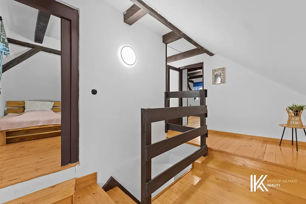 V patře jsou dvě oddělené ložnice, momentálně každá s kapacitou čtyř lůžek. Prostor působí útulně díky zachovaným trámům a nízkým stropům typickým pro staré chalupy. Je to ideální uspořádání pro větší rodiny, dvě spřátelené rodiny nebo chalupu určenou k pronájmu.