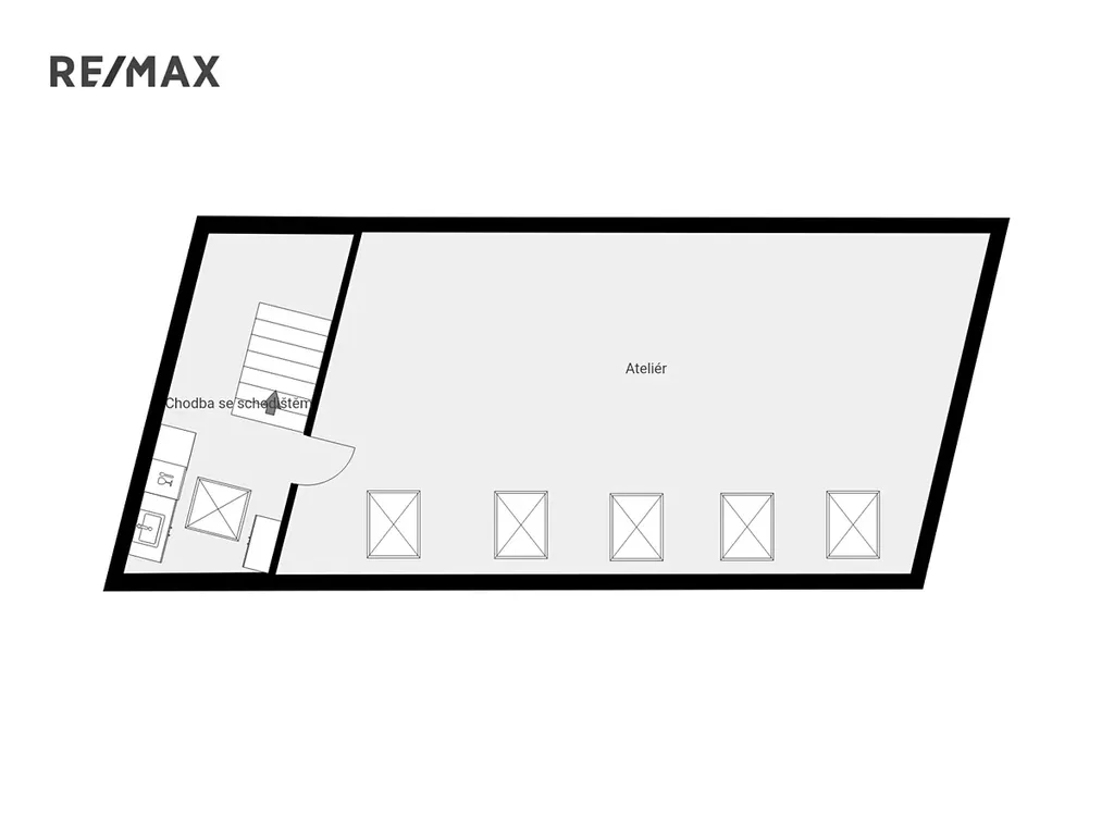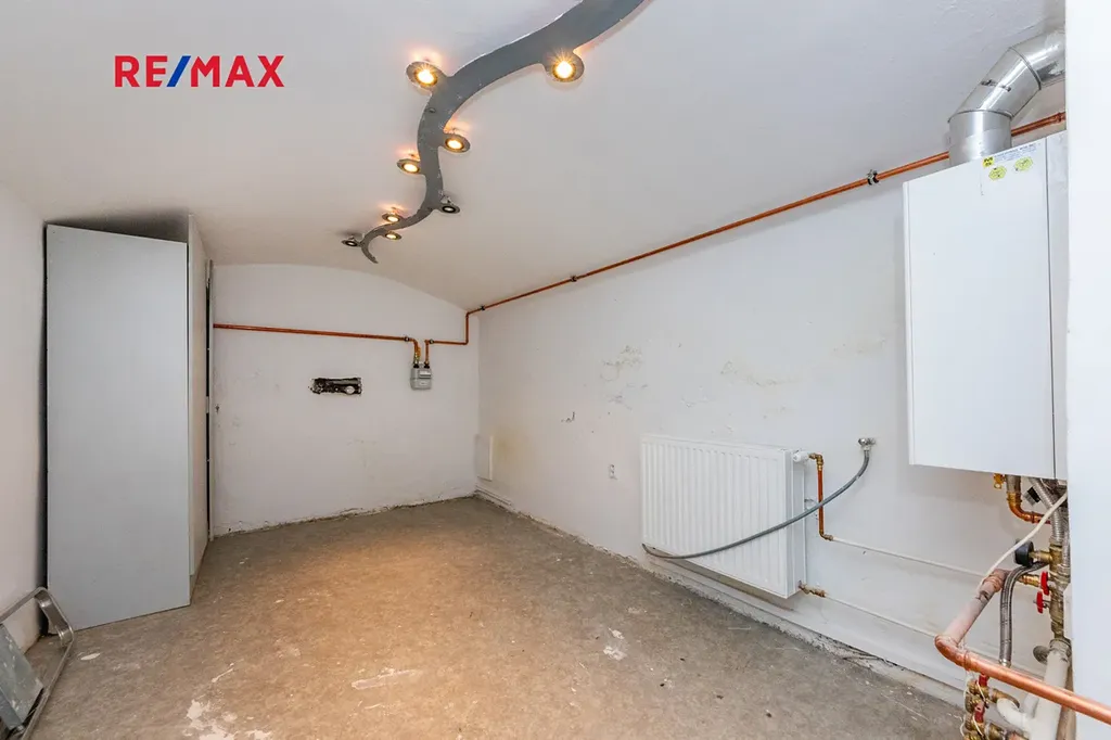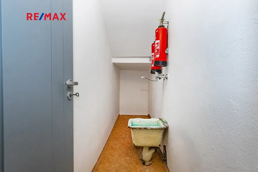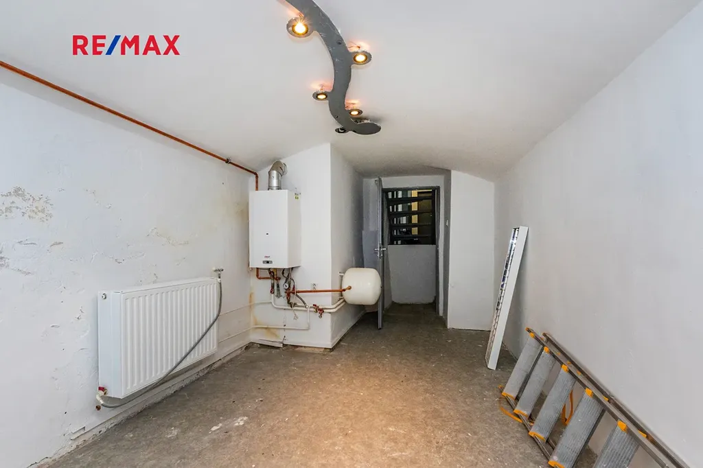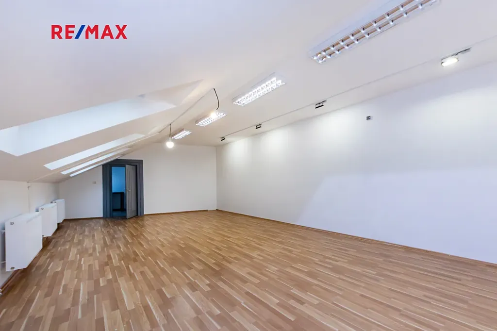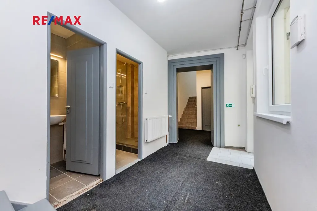 Prostor je dvoupodlažní a nabízí dvě hlavní místnosti, každou o výrazné ploše přes 50 m², což umožňuje pohodlné využití jako otevřený pracovní prostor, ateliér nebo showroom. Dále je zde samostatná koupelna, toaleta, sklepní prostor, kde se nachází plynový kotel pro vytápění, a chodba s výstupem na menší dvorek za budovou.