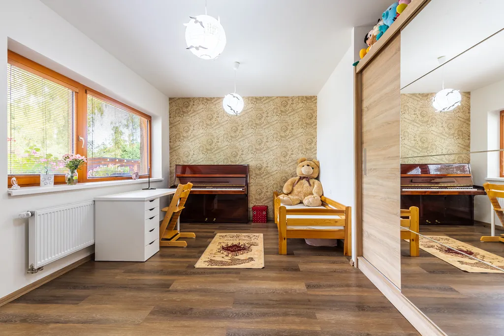 Dispozice domu - 1.PP - hlavní vstup/zádveří, hala se schodištěm, technická místnost, sklad a prostorná garáž. 1.NP - obývací pokoj ze kterého je francouzskými okny zpřístupněna pobytová terasa (31m²) a následně vstup do zahrady. Dále je zde kuchyňský kout s jídelnou, rodičovská ložnice s koupelnou s vanou, umyvadlem a WC. Dále se zde nachází dva dětské pokoje a druhá koupelna s WC. Z chodby je vstup do půdního prostoru (další úložný prostor). Dům byl kolaudován v roce 2015 a je ve velmi dobrém technickém stavu. K domu patří krásná a udržovaná zahrada se vzrostlými stromy, s altánem a bazénem. Dům je napojen na vlastní čistírnu odpadních vod, obecní vodovod, má však i vlastní studnu. Obecní kanalizace na hranici pozemku. Vytápění domu je řešeno plynovým kotlem.