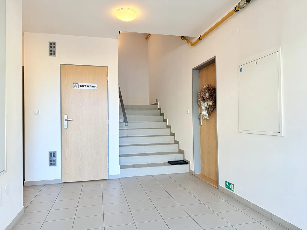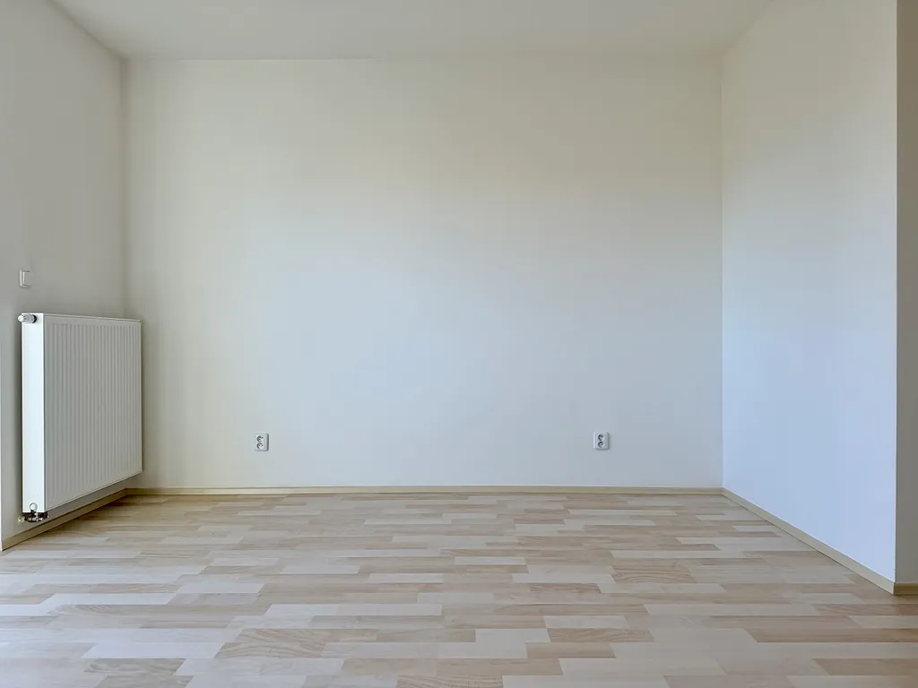 Dispozici tvoří vstupní chodba s vestavnou skříní na míru a velkým zrcadlem. Hlavní obytný prostor o rozloze 20,6 m² propojuje kuchyň, obývací část i ložnici do harmonického celku. Kuchyňská linka je vybavena vestavnými spotřebiči značky BOSCH – sklokeramickou varnou deskou, troubou, digestoří, dřezem a lednicí s mrazákem. Z obytné části přes francouzské dveře vstupujeme na balkon o velikosti přibližně 2 m², který poskytuje soukromí a prostor k relaxaci.