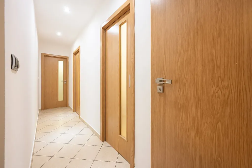 Dlouhá vstupní chodba s vestavěnou skříní rozděluje byt na společenskou a klidovou část. Kuchyně má i separátní jídelní část. Dalšími místnostmi jsou velký obývací pokoj a dvě ložnice.