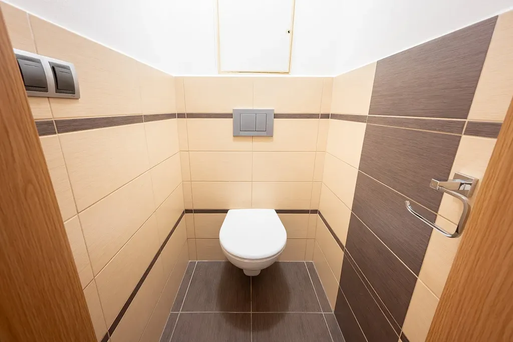 V bytě je koupelna vybavená sprchovým koutem a úložnými skříňkami. Je zde také umístěna pračka. WC je samostatně.