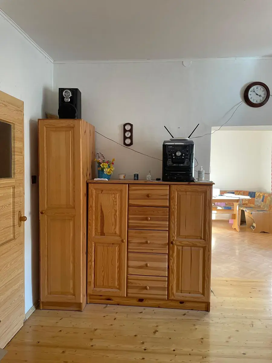 Dispozice domu je následující: v přízemí se nachází veranda, prostorná hala, koupelna s vanou, umyvadlem, bidetem a bojlerem, samostatné WC, ložnice, obývací pokoj s krbovými kamny a kuchyně s jídelním koutem. Kuchyň je vybavena spotřebiči – sklokeramická deska, horkovzdušná trouba, digestoř, myčka a lednice s mrazákem. Z obývacího pokoje je přístup do komory a dále do dvora.