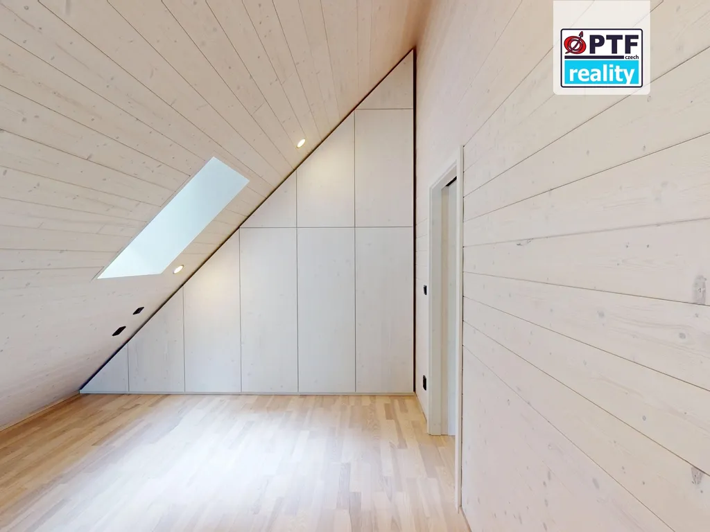 Úložné Prostor: V podkroví jsou již instalovány vestavěné skříně na míru, které efektivně využívají zkosený prostor.