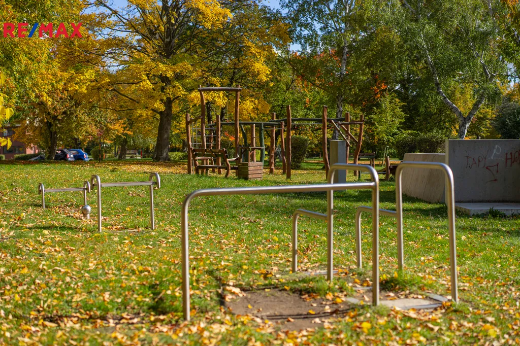 za domem dětská hřiště, prolézačky, houpačky a workout zóna.