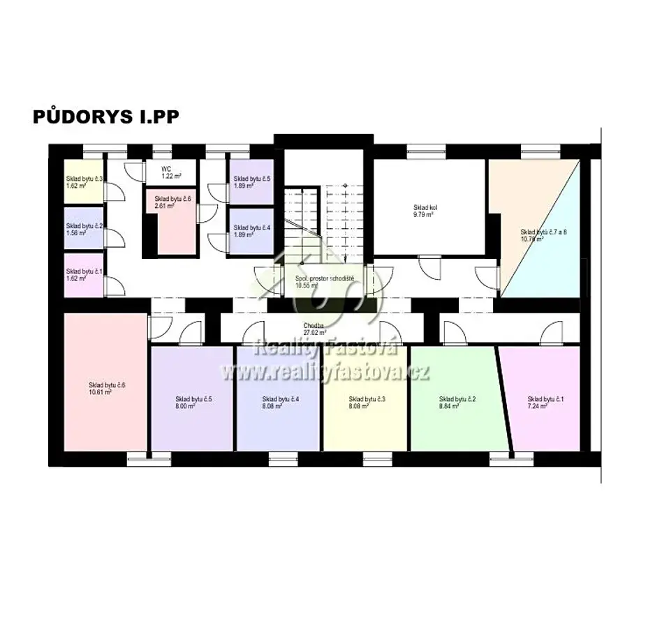 V 1. PP jsou sklepními prostory, skládající se ze společných prostor, kolárny a ke každému bytu náleží 2 sklepy a to jeden malý potravinový a druhý velký býv.uhlárna. Pouze k podkrovním bytům náleží ke každému 1 větší sklepní prostor, dodatečně vyčleněn ze sušárny.