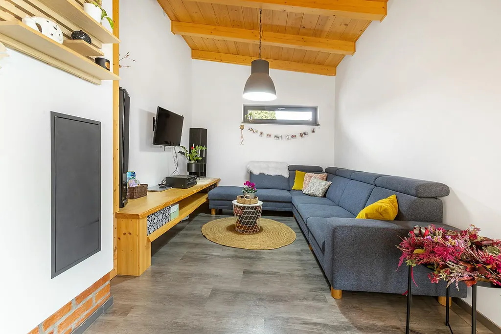 Srdcem domu je otevřený trámový prostor s galerií a velkou moderní kuchyní, krbem a jídelnou s východem do zahrady. V domě je spousta úložného prostoru včetně šatny v ložnici a dvou dětských pokojích.