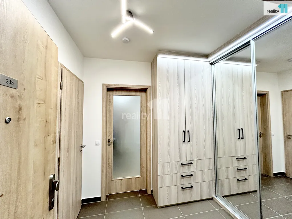 V chodbě jsou vestavěné osvětlené skříně, botník.