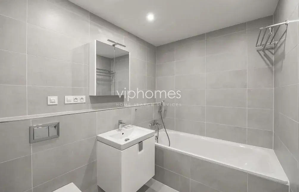 Interiér bytu, dispozice 2+kk, situovaného ve 2.patře novostavby, tvoří komfortní obývací pokoj s plně vybavenou kuchyní, (mikrovlnná trouba, myčka nádobí, lednice s mrazákem), ložnice orientovaná do upraveného vnitrobloku, koupelna (vana, sprchový kout, toaleta), balkon, vstupní hala.Vestavěné skříně v chodbě a v ložnici, pračka.