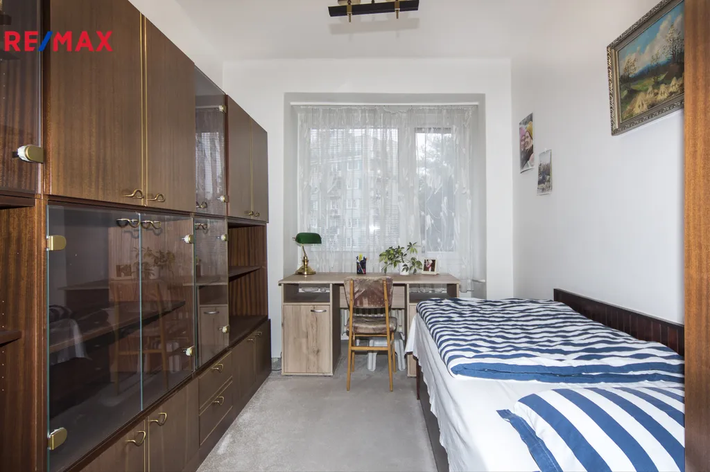 Nabízíme k prodeji příjemný byt 3+1 o celkové velikosti 63,7 m2. Byt má k dispozici balkon orientovaný do zahrádky u domu, nachází se na třetím podlaží cihlového domu s výtahem. Byt je šikovně rozložen, ve vstupní chodbě jsou vestavěné úložné skříně, vstup do ložnice, koupelny s vanou a WC zvlášť a dveře do obývacího pokoje. Z obývacího pokoje lze vstoupit na trojúhelníkový balkon, do kuchyňky a do další ložnice. Okna vedou na JV (ložnice), SZ (obývák, kuchyně a ložnice) , balkon je orientován na SV. V pokojích jsou na podlaze původní dřevěné parkety, ostatní plochy jsou kryté dlažbou či linem. V bytě je zaveden plyn (sporák), topení a teplá voda je řešena centrálně, z výměníku vedle domu. K dispozici je sklepní koje v suterénu domu. Pro obyvatele domu je možné využít i společné sušárny, mandl či kočárkárnu.
