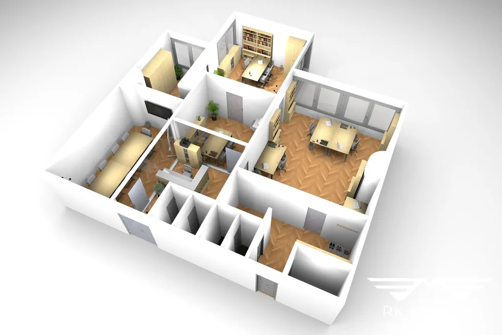 Dispozice je navržena s důrazem na funkčnost a vysoký standard pracovního prostředí. Součástí jsou dvě samostatné kanceláře, dvě zasedací místnosti, recepční část, vlastní kuchyňka, dvě sociální zařízení, serverovna a samostatná trezorová místnost splňující přísné bezpečnostní požadavky pojišťoven. Prostory jsou vybaveny moderním bezpečnostním systémem a nabízejí nadčasový, reprezentativní vzhled. Stávající moderní úpravy včetně vstupních dveří a recepce může nový nájemce ponechat a dále využívat.