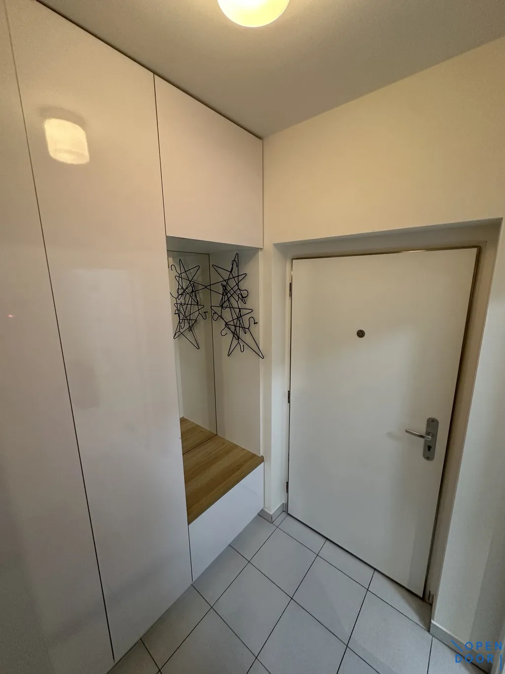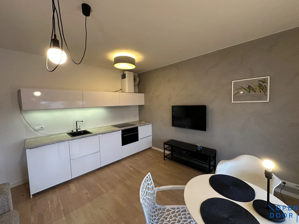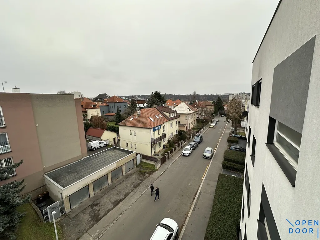 Byt se nachází v 5. NP moderního bytového domu s výtahem a nabízí se jako zařízený. Interiér bytu je velmi zdařile architektonicky vyřešen a nabízí pohodlně bydlení s dostatkem úložných prostor. Hlavní místnost s kuchyní a vstupem na balkón je vybavena rozkládací sedačkou, vestavěnými skříněmi, stolkem se židlemi a zařízenou kuchyňskou linkou (trouba, indukční varná deska, menší lednice s mrazákem, myčka nádobí, digestoř). Koupelna je s se sprchovým koutem, pračkou a WC. Předsíň nabízí také vestavěné skříně. Z bytu je krásný výhled a orientace bytu je na východ. Součástí jsou i rolety a markýza na balkóně. K bytu náleží sklepní kóje v přízemí ve vedlejším vchodě. K bytu je možné si pronajmout parkovací stání v domě za příplatek (velmi prostorné místo, cena dohodou).