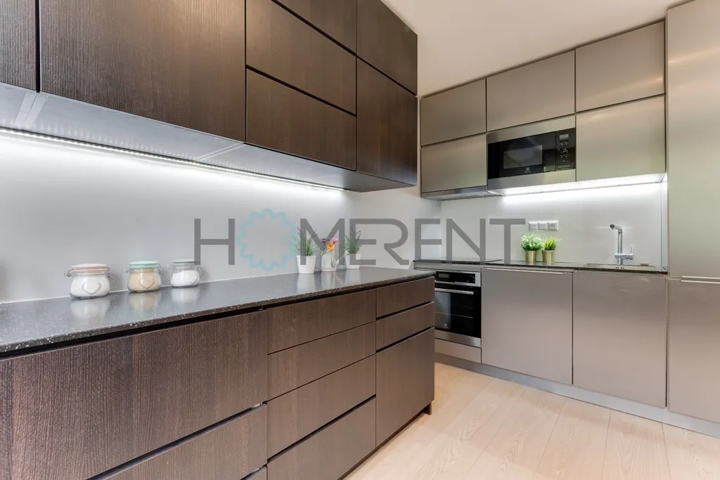 V bytě je nainstalovaná kuchyň s veškerými spotřebiči: lednice, digestoř, trouba, sporák, mikrovlnka, myčka, pračka/sušička.