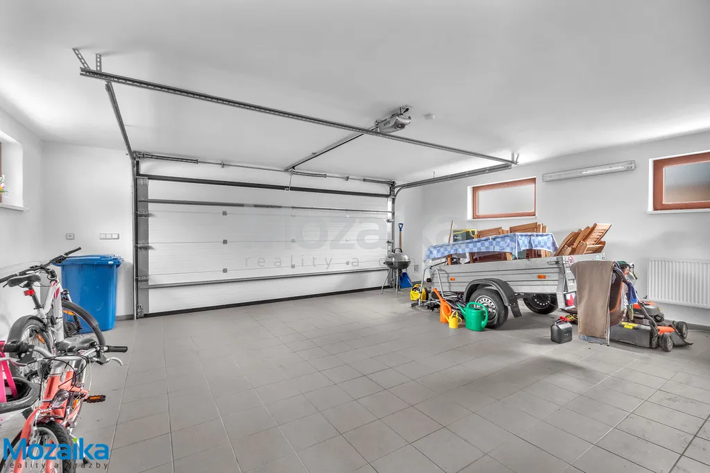 Okna jsou dřevěná typu EURO s izolačním dvojsklem a celoobvodovým kováním, což přispívá k výborné tepelné a zvukové izolaci. Vnitřní dveře jsou také dřevěné, osazené do obložkových zárubní. Garážová vrata jsou sekční, zateplená a vyrobená z kovové konstrukce.
