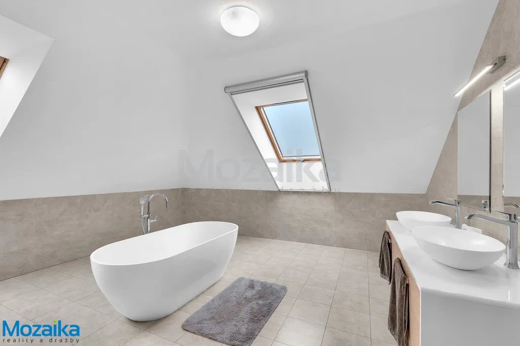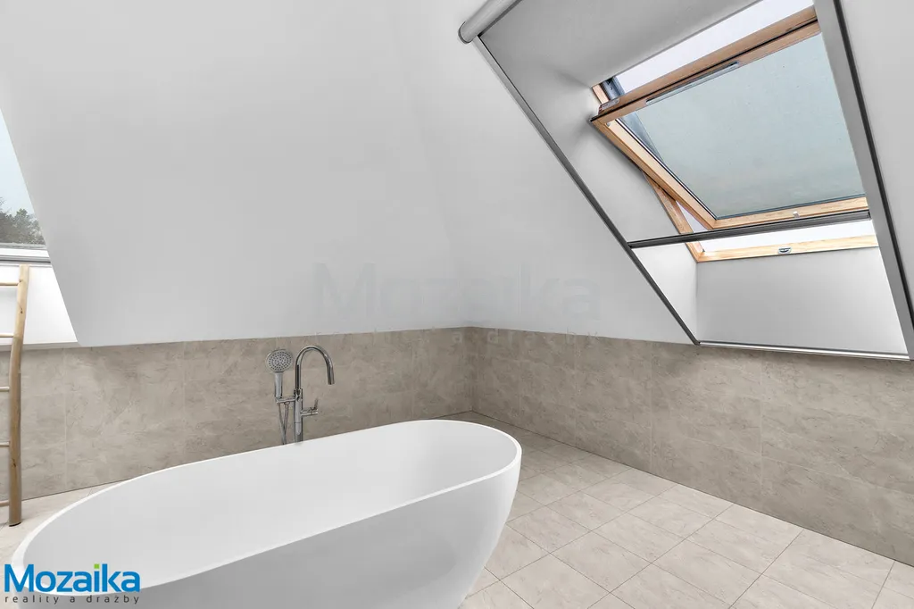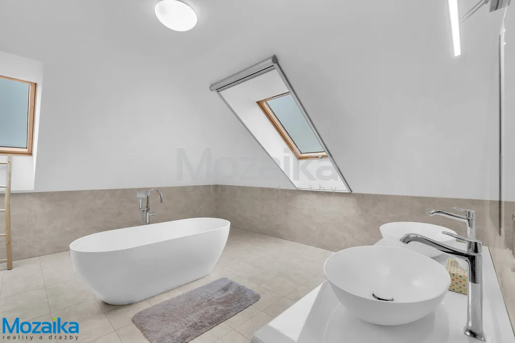 V podkroví (2. NP) se nachází chodba, ložnice, šatna, další pokoj, koupelna, samostatné WC a pracovna, která je přístupná přes garáž a nabízí tak možnost využití např. pro kancelář, služby apod. Dům tak nabízí dostatek soukromí pro každého člena rodiny.