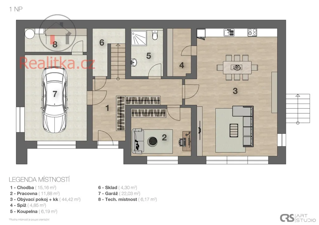 Dispozice byla pečlivě navržena s ohledem na variabilitu – budoucí majitel si může interiér přizpůsobit přesně podle svých představ a potřeb.