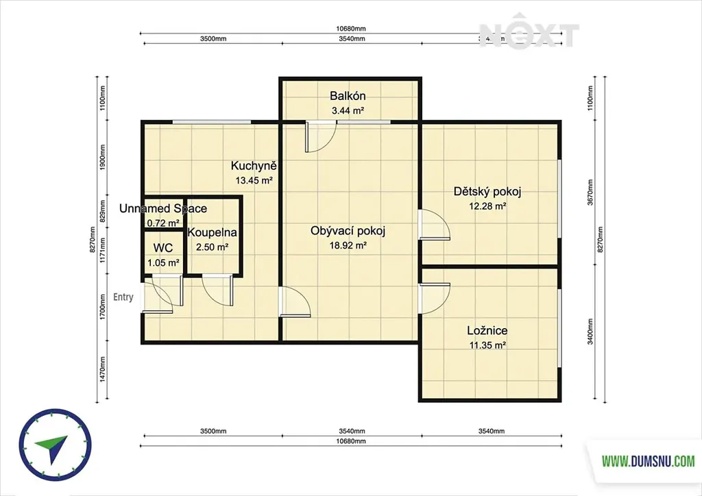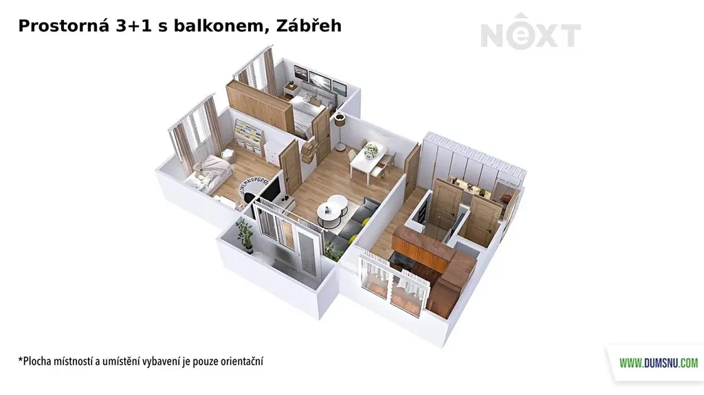 Dispozice je řešena velmi prakticky. Po vstupu do bytu se nachází chodba s vestavěnou skříní po celé délce, která poskytuje dostatek úložného prostoru. Kuchyň je vybavena velkou moderní linkou s vestavěnými spotřebiči. V koupelně, i přes její menší rozměr, našel své místo sprchový kout a je zde místo pro pračku se sušičkou (nejsou součástí vybavení). Ložnice i dětský pokoj jsou orientovány na východ, takže nabízejí dostatek denního světla i prostoru. Největší místností je světlý obývací pokoj s přímým vstupem na balkon, který je ideálním místem pro relaxaci.