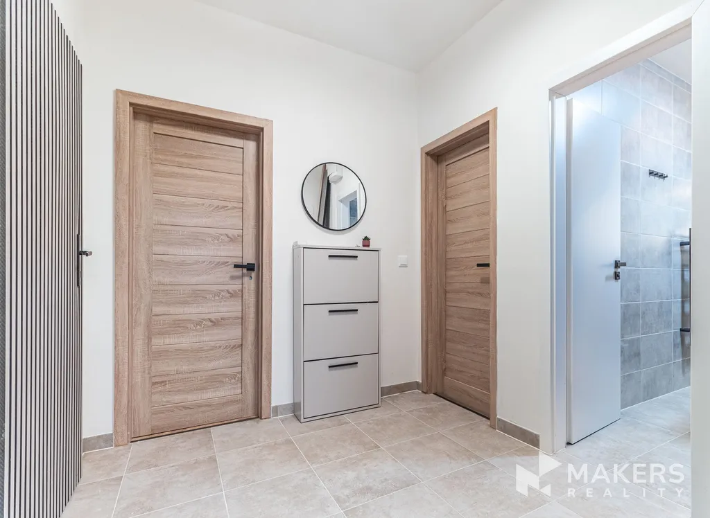 Soukromou část bytu tvoří dvě ložnice – prostorná hlavní ložnice a menší ložnice s praktickou komorou, která výrazně usnadňuje každodenní organizaci a nabízí potřebné úložné prostory. Moderně a funkčně řešená koupelna disponuje veškerou potřebnou sanitou, je vybavena pračkou i sušičkou a veškeré rozvody včetně elektroinstalace jsou zcela nové, takže nový majitel nemusí počítat s žádnými okamžitými investicemi do rekonstrukce.