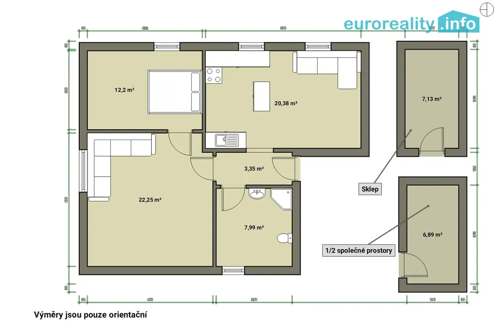 Součástí bytu je sklep, dále k nemovitosti náleží také 1/2 podíl na dalším sklepě umístěném u zadního vchodu domu, což výrazně zvyšuje úložný komfort a praktičnost bydlení.