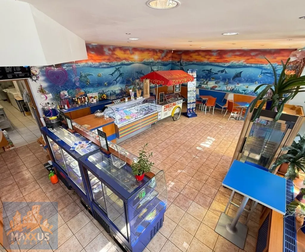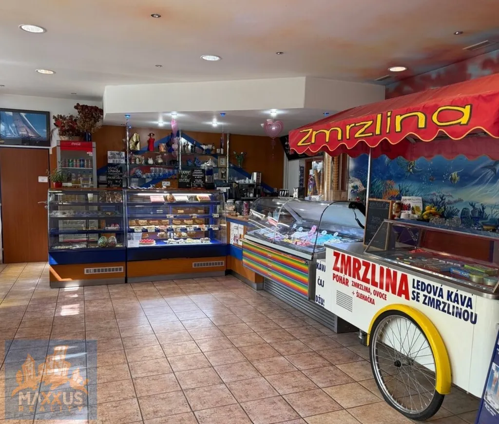 - kompletně vybavený interiér – nábytek, vitríny na zákusky i zmrzlinu