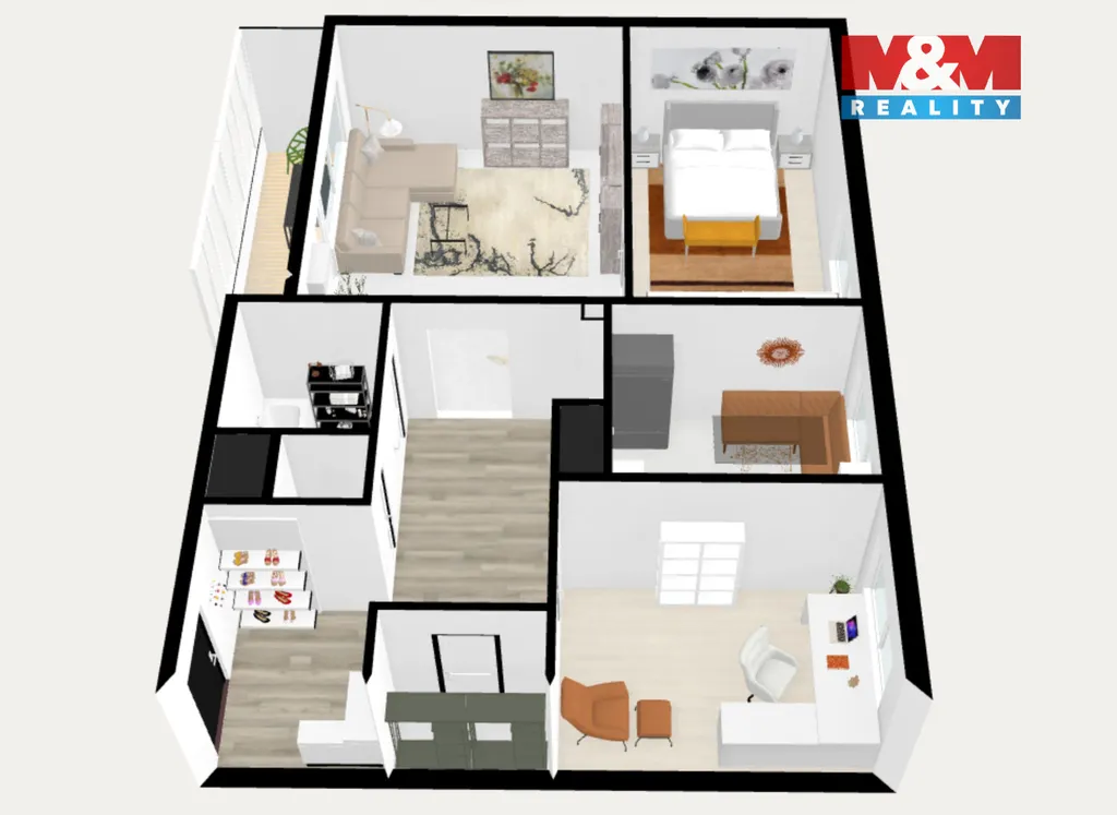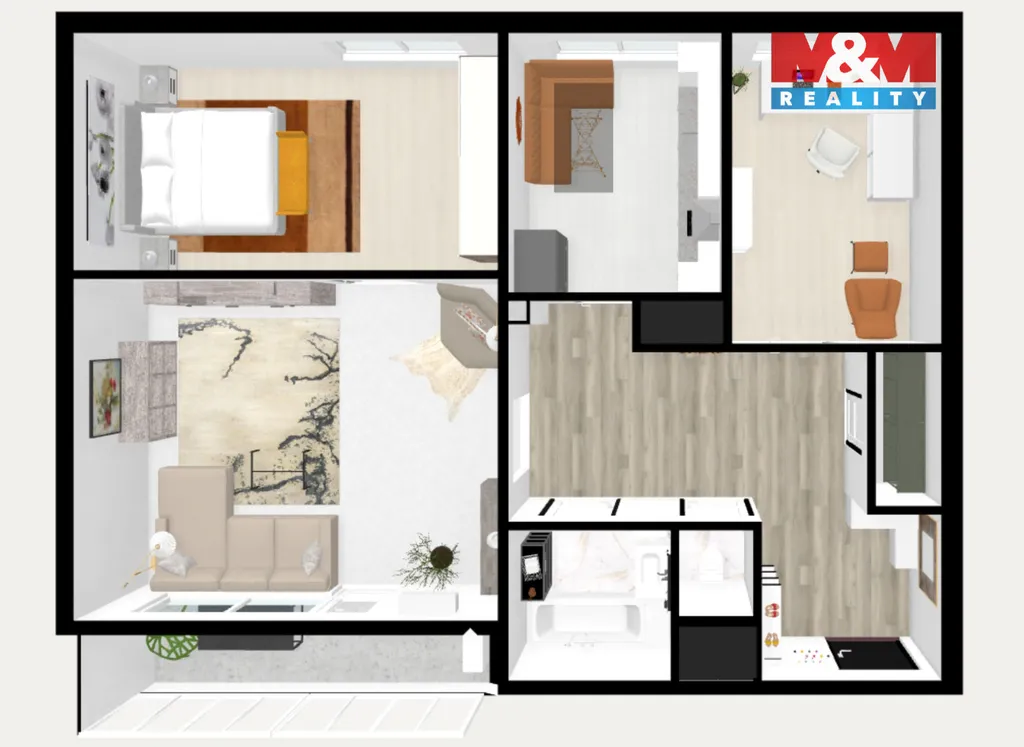 Dispoziční řešení a orientace: ložnice, kuchyně a pokoj jsou orientovány na sever, obývací pokoj se zasklenou lodžií a klimatizační jednotkou je orientován na jih, v chodbě se nachází spíž, kterou lze přetvořit na praktickou šatnu.