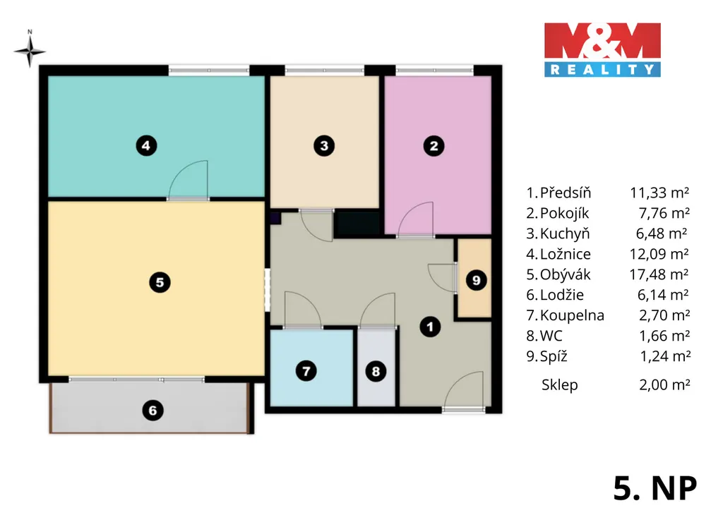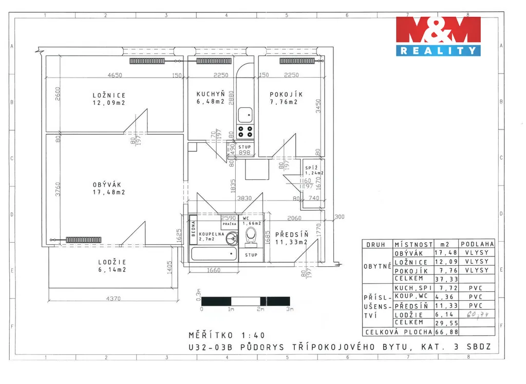 Celková plocha bytu činí 66 m², z toho lodžie 6 m². K bytu náleží také sklepní kóje o velikosti 2 m².